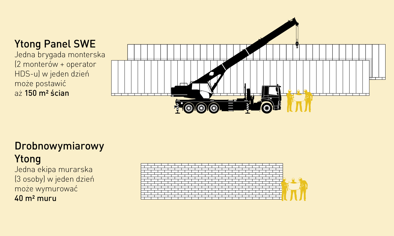 Wielkowymiarowe panele z betonu komórkowego Ytong Panel SWE pozwalają na ekspresowy montaż ścian konstrukcyjnych – zewnętrznych i wewnętrznych. System łączy zalety prefabrykacji z doskonałymi właściwościami betonu komórkowego, w tym wysoką izolacyjnością termiczną przegród, jak i najwyższą dokładnością wymiarową elementów. Dwuosobowa brygada monterów wraz z operatorem dźwigu przez 8 godzin jest w stanie postawić nawet 150 m² przegród w systemie paneli SWE. Ytong Panel SWE Ultra+ umożliwia wznoszenie ciepłych i energooszczędnych ścian jednowarstwowych.Ytong Panel SWE / Ytong Panel SWE Ultra+ pozwala wznosić ściany nawet 4 razy szybciej niż w tradycyjnych technologiach drobnowymiarowych!
